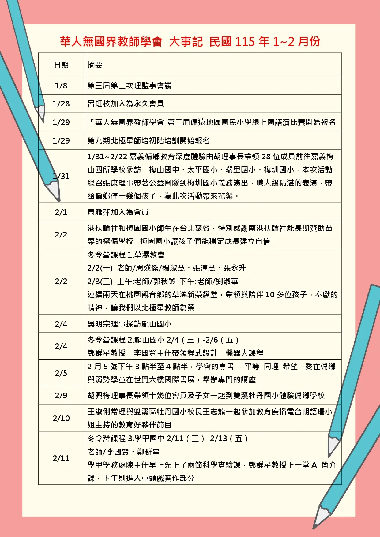 2024年開始「徒步·環島·偏鄉」,用腳體驗,走過新北市極偏學校德拉楠小學、雙溪區國中小、貢寮國小,並遠赴綠島;看看三年可以走過多少偏遠學校?們,讓北極星的光芒繼續交接傳承,指引更多的學子茁壯成長;我們還錄製了會歌MV及學會宣傳飲片,讓學會所期盼的、所關愛的、所謂之努力的目標與願景,承載在溫柔的旋律與歌詞之下,讓愛給偏鄉、弱勢孩子一個希望。